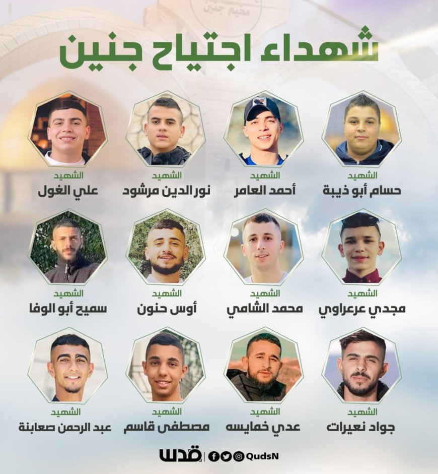 شيعت جماهير غفيرة من أبناء الشعب الفلسطيني في محافظة جنين، صباح اليوم الأربعاء، جثامين شهداء العدوان الإسرائيلي على مدينة ومخيم جنين.