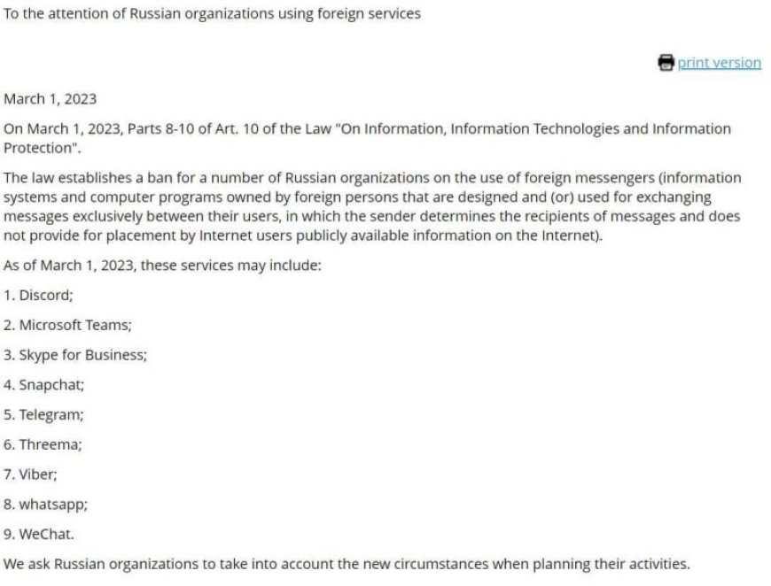 وقالت Roskomnadzor في بيان : "يفرض القانون حظرًا على عدد من المنظمات الروسية على استخدام الرسل الأجانب (أنظمة المعلومات وبرامج الكمبيوتر المملوكة لأشخاص أجانب والتي تم تصميمها و (أو) استخدامها لتبادل الرسائل حصريًا بين مستخدميها. ، حيث يحدد المرسل مستلمي الرسائل ولا ينص على وضع مستخدمي الإنترنت المعلومات المتاحة للجمهور على الإنترنت).