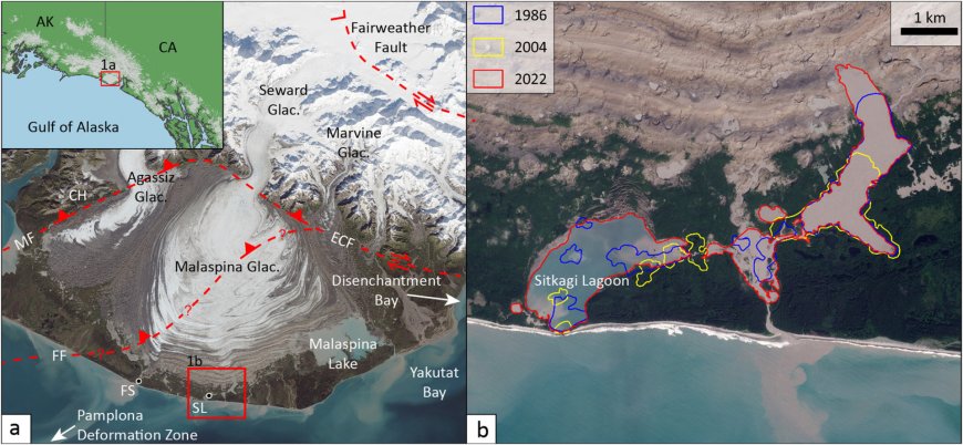 كشف مسح مفصل للجسم عن نهر مالاسبينا الجليدي - أحد أكثر الأنهار الجليدية شهرة في ألاسكا - أن كتلته تقع تحت مستوى سطح البحر وتقوضها القنوات ، مما يجعله من المحتمل أن يتراجع أسرع مما كان يعتقد سابقًا ، وفقًا لدراسة جديدة نُشرت في JGR Earth . السطح .