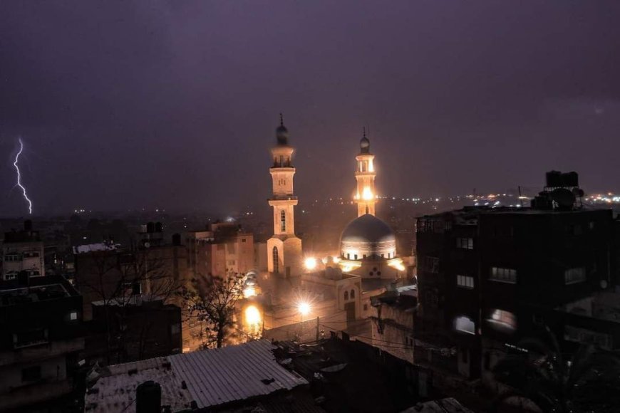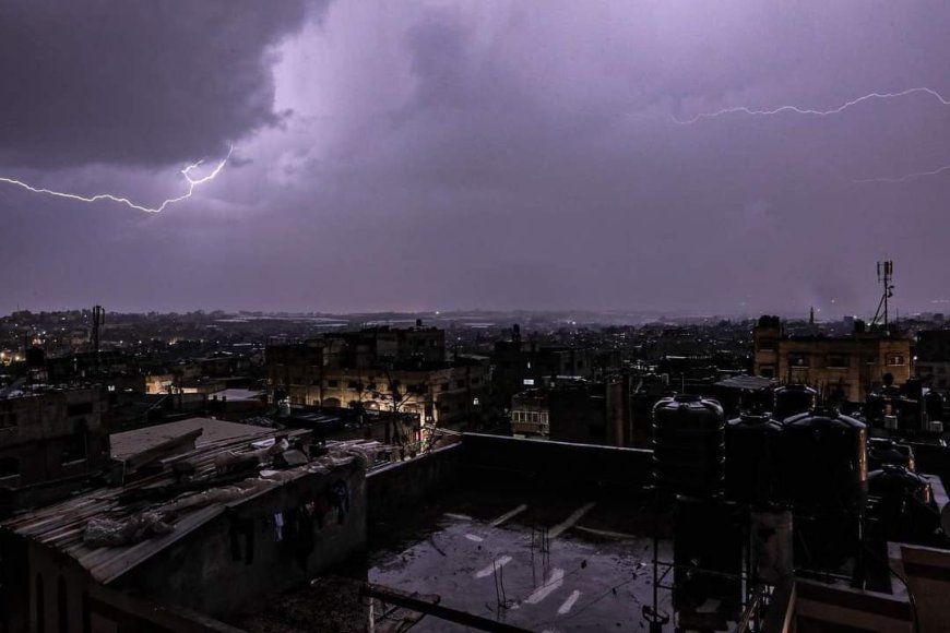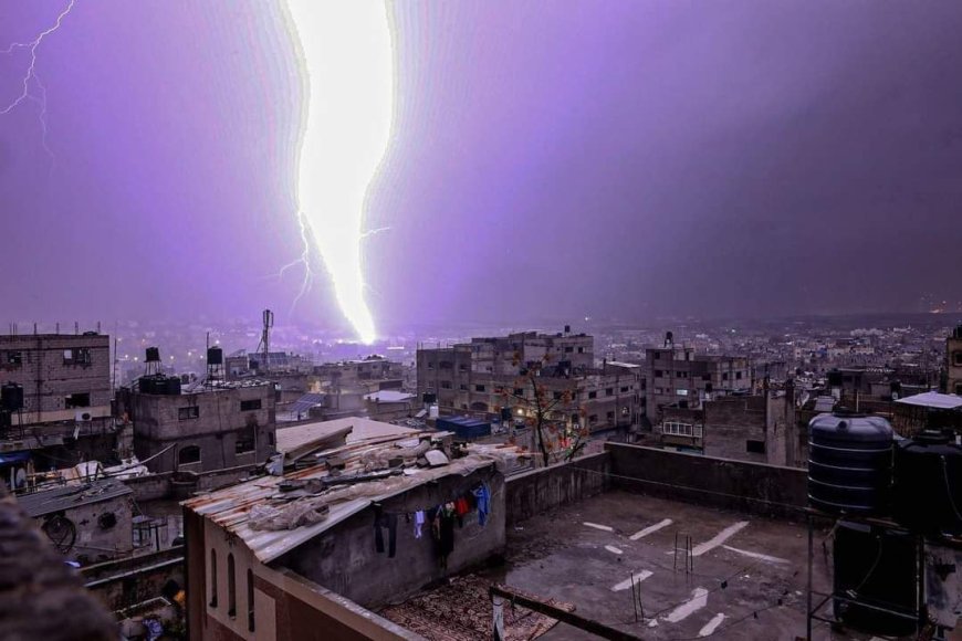 لقطات تظهر البرق في سماء غزة بالليل مع استمرار هطول الأمطار